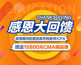 - 為了回饋新老學員對愛因森的厚愛,在疫情期間,愛因森教育開展感恩大回饋活動,所有到愛因森報名稅務師/CPA課程的同學,將會贈送15800元CMA精品課,僅限20個...