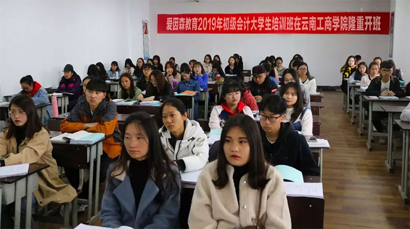 2019年2月21日,由愛因森教育主辦的2019年第一期初級會計大學生培訓班在云南工商學院隆重開班!本次培訓班特邀云南工商學院會計學院系主任張健老師、愛因森教育初級會計實務培訓主講老師夏云婷老師、愛因森教育經濟法基礎主講老師馮艷芳老師等老師為代表,為云南工商學院會計專業大學生組織初級會計職稱培訓學習。開課伊始,187名云南工商學院的大三、大四同學參加了本期的初級會計培訓。