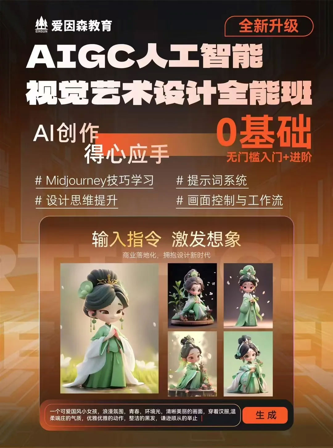 如果你作為求職者對擇業沒有方向,或是從業新人對目前的薪資不滿意,或許可以考慮轉行視覺藝術設計師;如果你已入職設計行業,但基礎技能薄弱或陷入靈感枯竭,想要突破職業瓶頸,推薦你來愛因森教育學習AIGC人工智能視覺藝術設計。