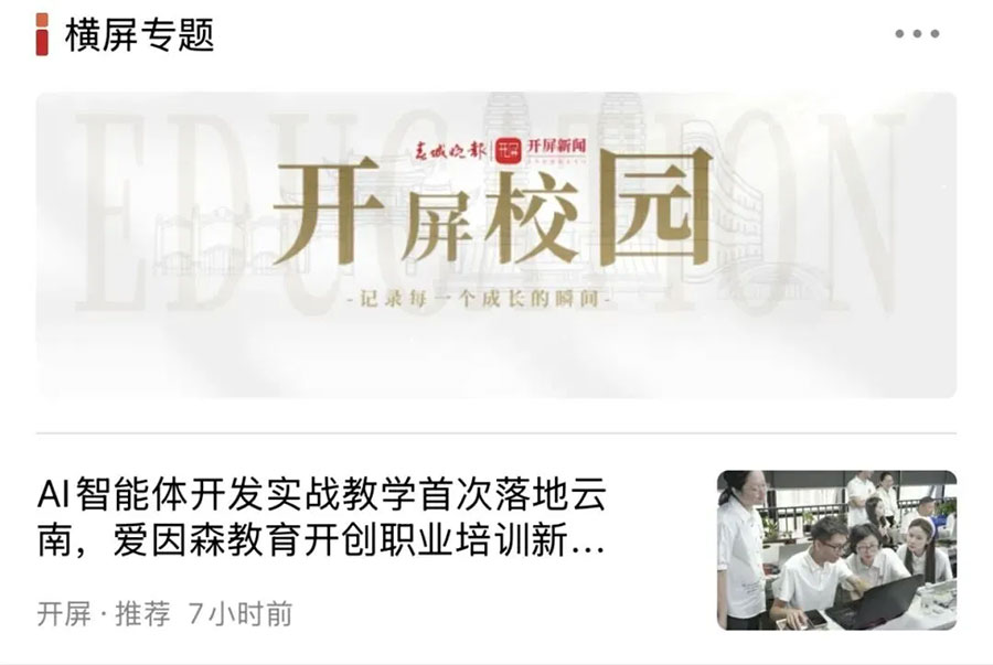 愛因森教育將“AI智能體開發(fā)應(yīng)用”實(shí)戰(zhàn)教學(xué)率先引入云南,成為全省職教領(lǐng)域先行者,并受到媒體廣泛關(guān)注。